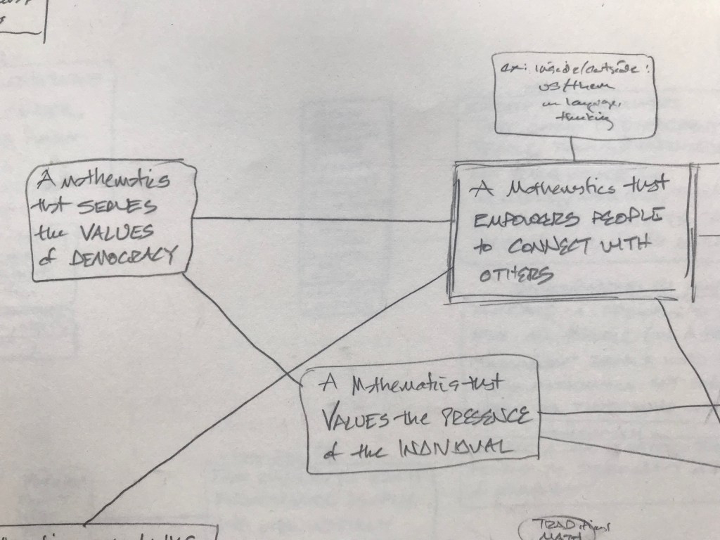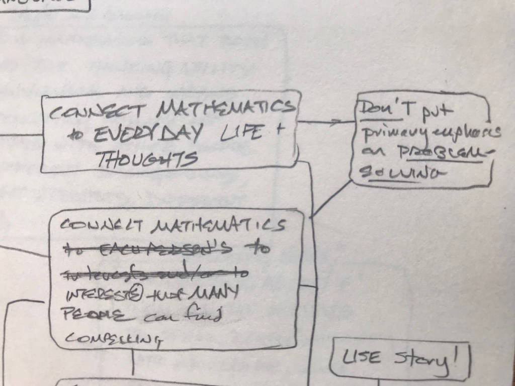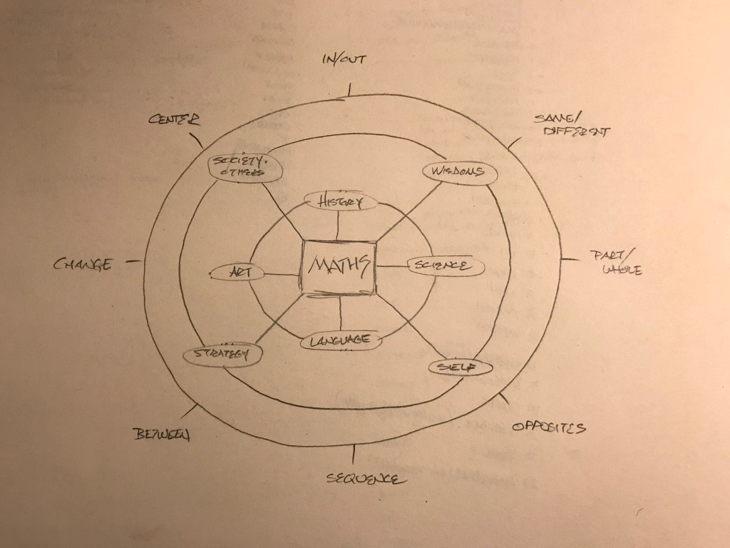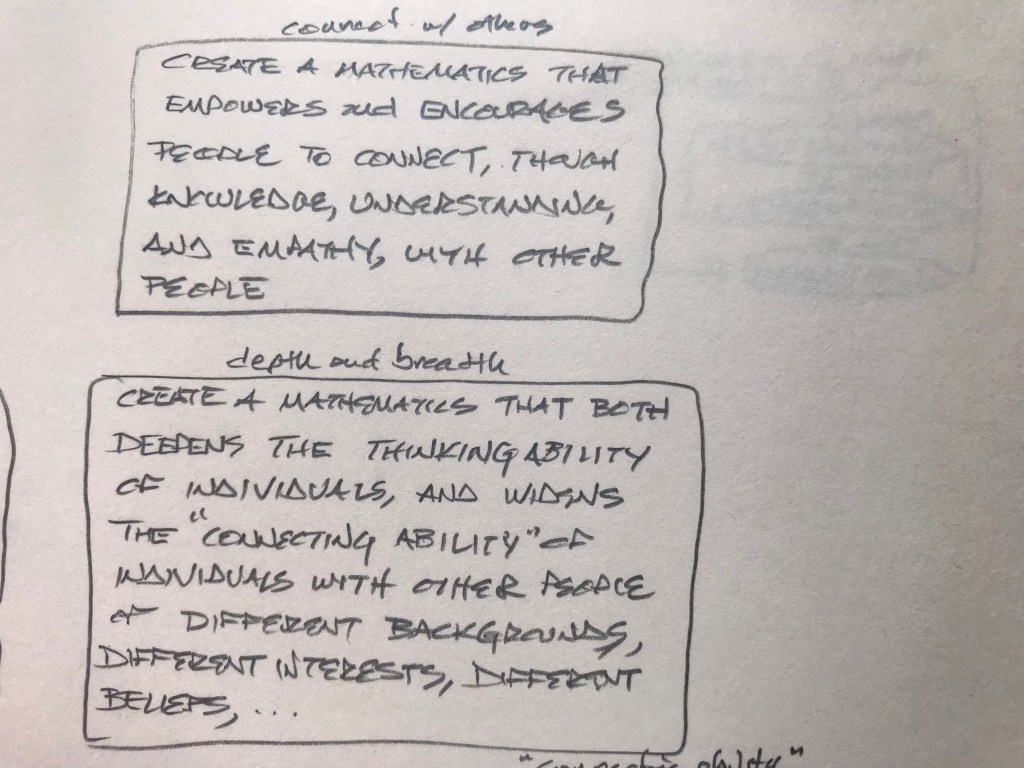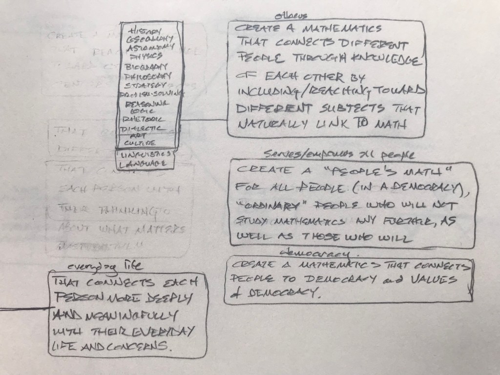 Friendship. Family. The sacred. Whatever each of us finds. Generosity. Humility. Caring for something beyond us. Wonder. Awe. The fragile amazement of being alive. What does mathematics have to do with any of this? Less than. Equal to. Greater than. Less than it needs to. Millenia of European math woven with Christianity, Islam, war; science, puddles of sewage, stores of grain; peasant rebellions, ocean navigations, mapping the globe; Europe, Rome, Greece; Babylonia, India, Egypt: Euclid, Alexandria, Alexander, the library; the Mediterranean, the Nile, Cleopatra; Caesar, Cicero: “x about friendship”; Marcus Aurelius: “x about y”; Quintilian argues that to be a rhetorician, one must be a good person.