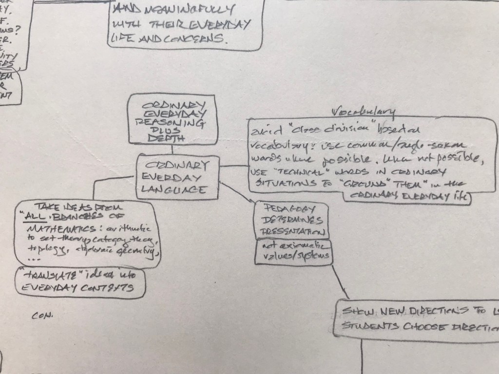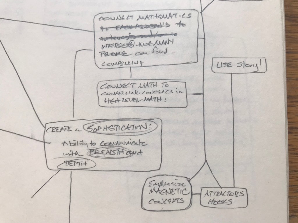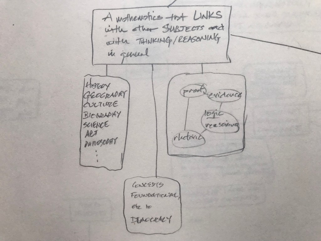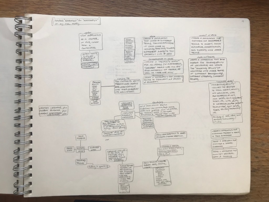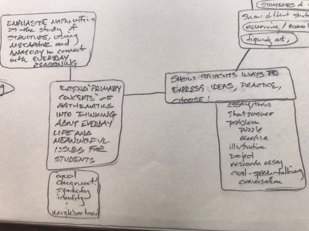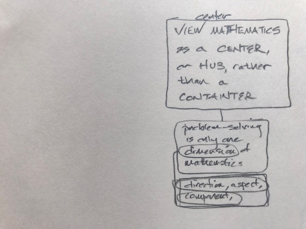 Friendship. Family. The sacred. Whatever each of us finds. Generosity. Humility. Caring for something beyond us. Wonder. Awe. The fragile amazement of being alive. What does mathematics have to do with any of this? Less than. Equal to. Greater than. Less than it needs to. Millenia of European math woven with Christianity, Islam, war; science, puddles of sewage, stores of grain; peasant rebellions, ocean navigations, mapping the globe; Europe, Rome, Greece; Babylonia, India, Egypt: Euclid, Alexandria, Alexander, the library; the Mediterranean, the Nile, Cleopatra; Caesar, Cicero: “x about friendship”; Marcus Aurelius: “x about y”; Quintilian argues that to be a rhetorician, one must be a good person.