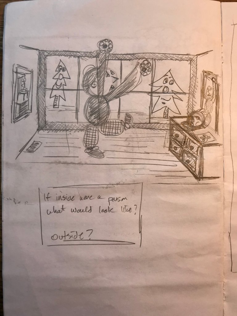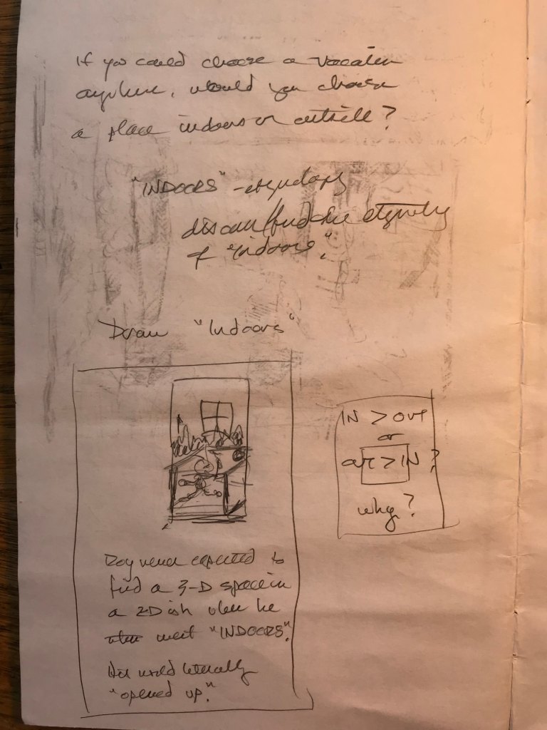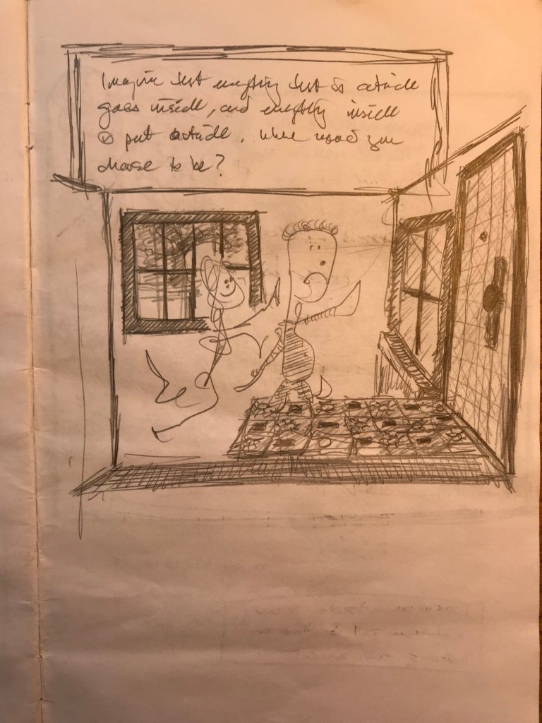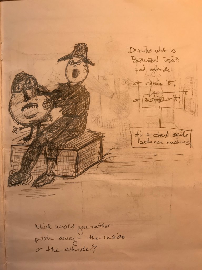 A raven landed on a fence post beside the road as we drove past. The night before I dreamed of a place full of gunfire and destruction, and then riding in the back of my childhood car, a Volkswagen bus, and my mother, who died a few years ago, driving me away from that to the country house I grew up in, and then I made a joke, a joke we had shared many times over the years, and I heard my mother laugh. A wonderful laugh. A wonderful sound. And then I woke. My seven year old daughter sketched my friend’s face before he returned to Warsaw, a city I had visited as an ignorant teenager forty years ago. He brought the sketch with him. The raven and the post. The dream and my mother. Santa Fe, NM, and Warsaw, Poland. Connections. Links. Relationships. Arrows. An arrow, a map. A mapping, a function. . . . . here I am.