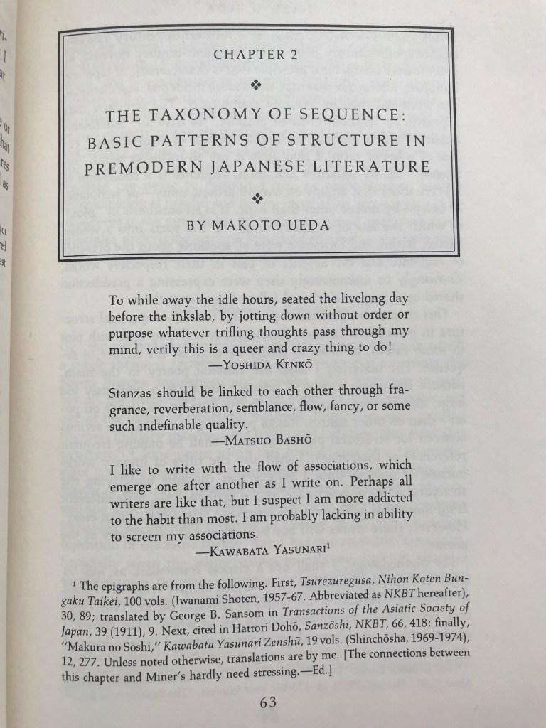 “We might probe into the reasons why classical Japanese poets and writers were so fond of repetitive method, of temporal sequence , and especially of qualitative (or personal) progression.” (104)